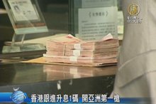 2015-12-17 12:43:03美國聯準會(Fed)升息後,香港金管局,宣布跟進,升息上調 基本利率1碼,是9年來首次調升,也是亞洲國家中,第一個跟進地區。香港金融管理局,周四宣布跟進升息,基準利率從0.5%調升到0.75%。市場分析認為,香港港元貨幣政策,與美國步調一致,但香港經濟隨著中國轉弱,升息對香港經濟的衝擊可能更大,尤其,不動產市場,更可能出現泡沫。
