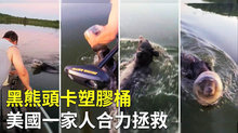 黑熊頭卡塑膠桶 美國一家人合力拯救