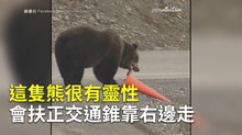 這隻熊很有靈性 會扶正交通錐靠右邊走