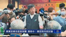 2022-09-29 12:44:30九合一選戰倒數不到兩個月,台北市長參選人陳時中前一晚發文,希望選舉回歸正軌,今天(29日)上午陳時中到東門市場拜票,被媒體問到,是否希望周玉蔻事件落幕,陳時中說,並不只是針對單一事件,而是希望整體選舉,能在陽光下正向進行。至於對手蔣萬安,也對此表示看法。