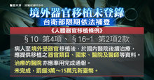 2018-10-04 20:38:00再來看到,器官移植議題,成為台灣政壇討論話題,不過,立委趙天麟週三(3日)質詢,指出器官移植登錄機制在境外移植把關失靈,僅5.61%完成通報,令人羞愧。衛福部長陳時中表示,這會造成人權問題,限期完成全面清查,若未完成補登的移植者與醫院,將依法開罰,也考慮健保將不給付抗排斥藥。