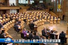 2017-03-14 07:08:20早安新唐人,先帶您關心,英國歐脫的談判進程,就在今天台北時間凌晨,英國下議院否決了 上議院先前通過的兩項條款,上議院之前通過條款包括,保證 旅英歐盟公民仍能留在英國,以及國會可以否決最終脫歐條款。現在法案被送 回上議院,脫歐法案預計最快14日可以啟動;不過,因為不滿脫歐,蘇格蘭打算再次發起獨立公投。另外,前天,歐洲有超過40個城市,舉辦「挺歐盟」遊行,強調他們才是主流聲音。