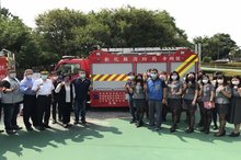 2021-12-14 15:29:49彰化縣不動產開發商業同業公會為回饋地方,強化救災戰力,今天(14日)上午在彰化縣政府前廣場,由理事長吳水富捐贈1輛價值約420萬元小型水箱車給彰化縣消防局,彰化縣長王惠美親自代表受贈。