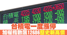 2020-07-27 12:34:30台積電上周傳出利多消息,尤其半導體大廠英特爾7奈米訂單,可能外包台積電,帶動台積電周一股價大漲,開盤15分鐘一度漲停,也帶動台股加權指數突破12682歷史新高,一度站上12686歷史新天價,創下台股市上最高點紀錄。