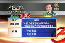 2011-03-05 21:05:13民進黨成功拿下台南市和高雄市兩席立委,那麼由於民進黨黨主席蔡英文,在選前喊出「2席全勝,重返執政」的口號,將這場立委補選定調為2012總統大選的前哨戰,因此,在立院版圖的拓展,給了民進黨在提昇士氣上,一個關鍵性的力量。好,那麼帶您分別來看到,這次取得兩席立委席次的新科立委。首先來看到,台南市第四選區的許添財,以 49,002票領先對手,許添財,民國40年1月23日出生,台灣台南人,中國文化大學經濟學系碩士、學士,擔任過台南市市長以及立法委員。好,接著來看到高雄市的部份,同樣是由民進黨籍的林岱樺拿下,民國6