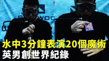 2020-11-27 11:23:32在水中也能變魔術嗎?英國一名男子不但在水中表演魔術,而且在短短的3分鐘裡,表演了20個魔術,他因此創下了金氏世界紀錄。
