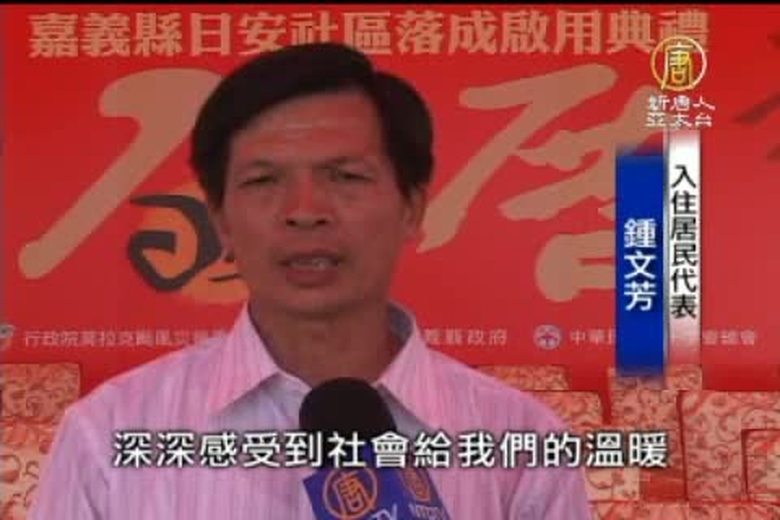 莫拉克八八風災在嘉義縣山區部落造成重大災情,災後嘉義縣政府配合紅十字會積極覓地籌建永久屋。一年後的9月12日,位於嘉義縣番路鄉轆仔腳的第1期90 戶永久屋「日安社區」,隆重的舉行入住儀式。而總統馬英九,也特別參加了落成啟用典禮。 //asset1.ntdtv.com.tw/public/uploads/video/2010/09/14/20100914-172956.flv 嘉義日安社區永久屋|落成啟用|新唐人|政治|財經|社會|體育|影劇|娛樂|教育|醫藥|消費|新聞|民調|藝文|科技|時事|即時新聞|亞太|節目2010-09-13 23:09:29