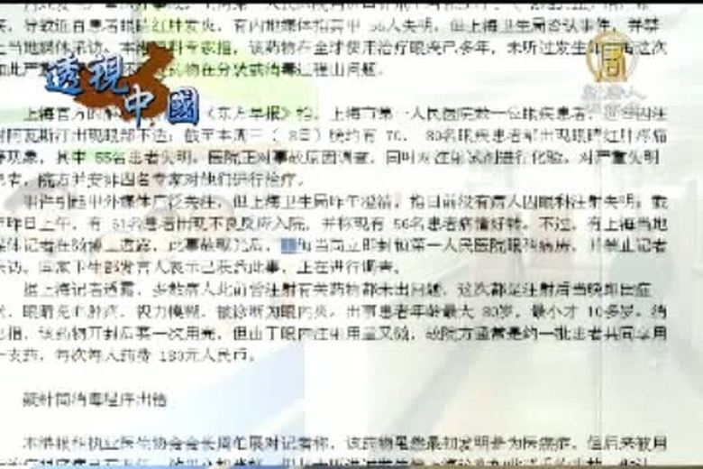上海第一人民醫院,最近傳出為眼疾患者注射治療腫瘤藥物的「阿瓦斯汀」來治療眼疾,卻導致55名病患失明的事件,引起各方關注。 //asset1.ntdtv.com.tw/public/uploads/video/2010/09/14/20100914-170868.flv 上海55名患者|注射「阿瓦斯汀」失明|新唐人|政治|財經|社會|體育|影劇|娛樂|教育|醫藥|消費|新聞|民調|藝文|科技|時事|即時新聞|亞太|節目2010-09-13 22:26:26