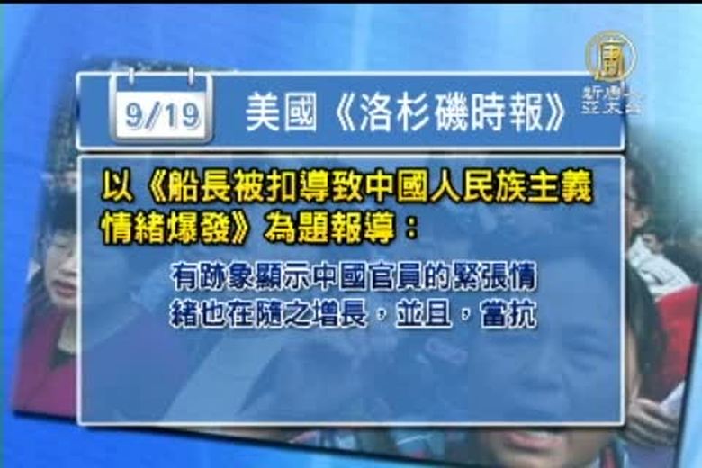 針對中國漁船衝撞日本海巡船所引發的外交爭端,日本各大傳媒週一都以「中共停止中日部長級交流」和「日本駐華大使又受到電話抗議」為標題,報導中日撞船糾紛,在日本司法機關周日延長中國漁船船長扣留期的情況之下,有再次被推高的局勢。西方主要媒體怎麼看待中日釣魚台爭議升級?我們的整理報導。 //asset1.ntdtv.com.tw/public/uploads/video/2010/09/21/20100921-222576.flv 西方報紙評中日緊張關係加劇|新唐人|政治|財經|社會|體育|影劇|娛樂|教育|醫藥|消費|新聞|民調|藝文|科技|時事|即時新聞|亞太|節目2010-09-20 22:40:04