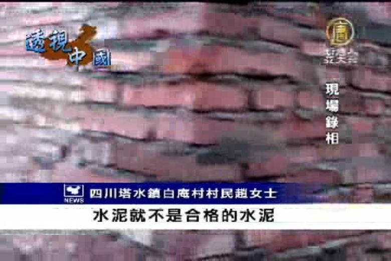 四川大地震摧毀塔水鎮很多的房子,災後4個月當地就展開重建,原訂09年1月交房,幾百戶房子出現嚴重質量問題,在村民提出抗議下停工,目前災民在沒有新房子住的情況下又要支付房貸,多次到鎮政府反映都沒有結果。 //asset3.ntdtv.com.tw/public/uploads/video/2010/09/21/20100921-218134.flv 川震塔水鎮重建|又見豆腐渣工程|新唐人|政治|財經|社會|體育|影劇|娛樂|教育|醫藥|消費|新聞|民調|藝文|科技|時事|即時新聞|亞太|節目2010-09-20 22:28:25
