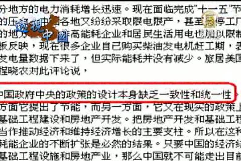 中共官方近日坦承,要完成「十一五」節能減排指標規劃中的降低能耗20%的目標,困難重重。專家也表示,只要中國的經濟發展,繼續依靠基礎工程設施和房地產開發,中國就不可能實現節能的目標。 //asset2.ntdtv.com.tw/public/uploads/video/2010/09/22/20100922-225533.flv 「十一五」降低能耗20%|困難重重|新唐人|政治|財經|社會|體育|影劇|娛樂|教育|醫藥|消費|新聞|民調|藝文|科技|時事|即時新聞|亞太|節目2010-09-21 22:21:22