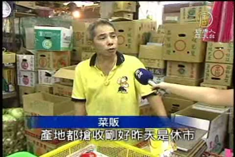 菜價到底有沒有比較貴,因為市場裡面,葉菜類和水果,售價還沒有反映,今天的到貨量都是颱風前,民眾搶收下來的蔬菜,結果價錢反而便宜。 //asset2.ntdtv.com.tw/public/uploads/video/2010/09/22/20100922-225488.flv 颱風前搶收|葉菜類反小跌|新唐人|政治|財經|社會|體育|影劇|娛樂|教育|醫藥|消費|新聞|民調|藝文|科技|時事|即時新聞|亞太|節目2010-09-21 22:08:35