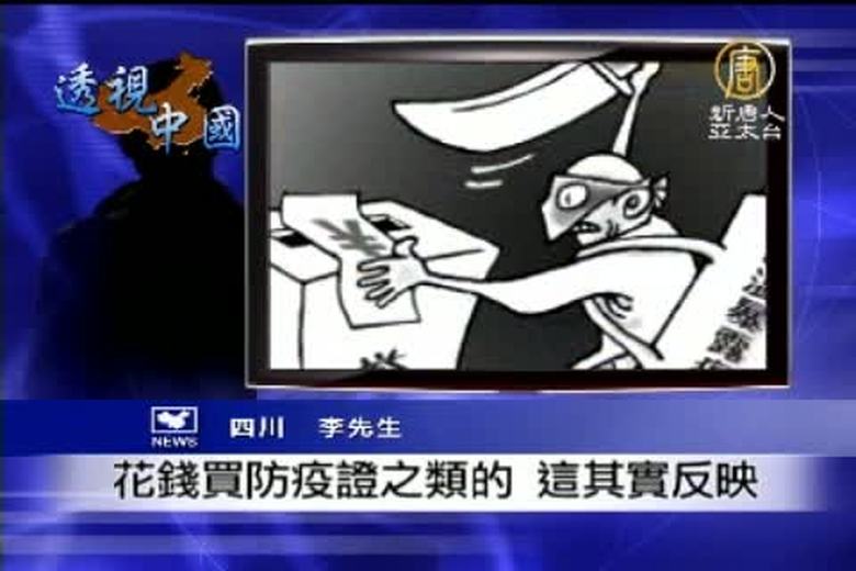 中國1億兒童將於20日前完成麻疹疫苗接種,大陸民眾反映,很多家長對國產疫苗沒信心,於是傳出家長花錢買防疫證,大陸醫生表示,麻疹疫苗強化免疫只是衛生部的一項政治任務,孩子出事都沒人負責。 //asset1.ntdtv.com.tw/public/uploads/video/2010/09/23/20100923-231800.flv 對疫苗沒信心|中國家長花錢買防疫證|新唐人|政治|財經|社會|體育|影劇|娛樂|教育|醫藥|消費|新聞|民調|藝文|科技|時事|即時新聞|亞太|節目2010-09-22 22:23:45