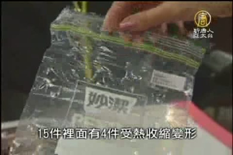 婦女與小孩的安全的確是社會要來共同關注的問題。那麼接下來的這則新聞,相信媽媽們也都會相當關心。北市衛生局首次抽查市售免洗餐具耐熱度,結果發現,15件樣品中,有3個品牌的保鮮袋,受熱就收縮,和包裝標示耐熱度110度明顯不符,另外免洗塑膠杯也在裝熱水後明顯變型,市府要求這些產品必須立刻下架。 //asset2.ntdtv.com.tw/public/uploads/video/2010/12/14/20101214-659873.flv 受熱就收縮|免洗餐具不耐熱|免洗餐具|耐熱度|衛生局|抽查|新唐人|政治|財經|社會|體育|影劇|娛樂|教育|醫藥|消費|新聞|民調|藝文|科技|時事|即時新聞|亞太|節目2010-12-13 22:51:04