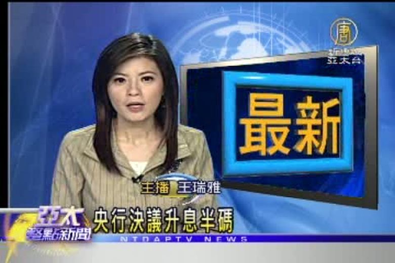 央行升息半碼,同時大幅調高外資的新台幣活期存款準備率,提高金融機構的承作成本,央行總裁彭淮南宣布,成立專案小組,針對避險基金進行研究,要讓炒匯投機客有所警惕。 //asset3.ntdtv.com.tw/public/uploads/video/2010/12/31/20101231-834954.flv 三大利率各升半碼|彭淮南:趕熱錢|利率|升息|中央銀行|彭淮南|新唐人|政治|財經|社會|體育|影劇|娛樂|教育|醫藥|消費|新聞|民調|藝文|科技|時事|即時新聞|亞太|節目2010-12-30 22:38:22