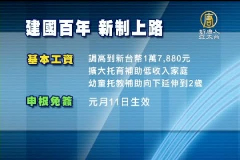 那麼明天就是建國百年元旦,來提醒觀眾朋友,將有多項新措施上路,包括基本工資將調高到新台幣1萬7,880元;在社會福利方面則擴大托育補助、低收入家庭幼童托教補助向下延伸至2歲。至於申根免簽也將在元月11日生效,民眾享有赴歐洲申根區35國或地區免簽證待遇。 //asset3.ntdtv.com.tw/public/uploads/video/2011/01/01/20110101-842879.flv 建國百年|多項新措施上路|新唐人|政治|財經|社會|體育|影劇|娛樂|教育|醫藥|消費|新聞|民調|藝文|科技|時事|即時新聞|亞太|節目2010-12-31 22:34:34