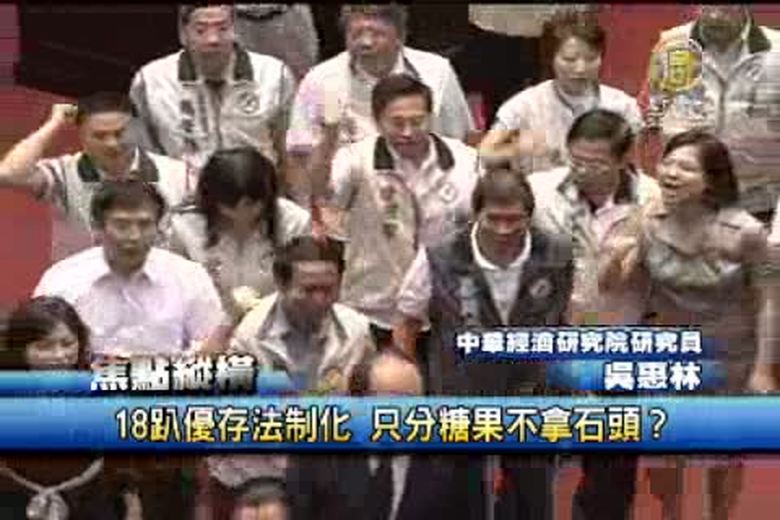 儘管考試院長關中發布聲明,強調公務員在民國84年7月1日以後的年資,都不再適用18趴條款,不過這仍舊難熄十八趴改革案,所掀起的爭議。有媒體評論,認為:政府拿掉石頭的事不敢做,卻搶著發糖果,這樣的「改革」,和民眾的期待差太遠。究竟怎麼理解這個政府說:基於「信賴保護原則」的18趴優惠存款?我們今天的焦點縱橫,為您探討。 //asset3.ntdtv.com.tw/public/uploads/video/2011/01/05/20110105-874192.flv 18趴優存法制化|只分糖果不拿石頭?|公務員|優惠存款利率|十八%|新唐人|政治|財經|社會|體育|影劇|娛樂|教育|醫藥|消費|新聞|民調|藝文|科技|時事|即時新聞|亞太|節目2011-01-04 21:09:22