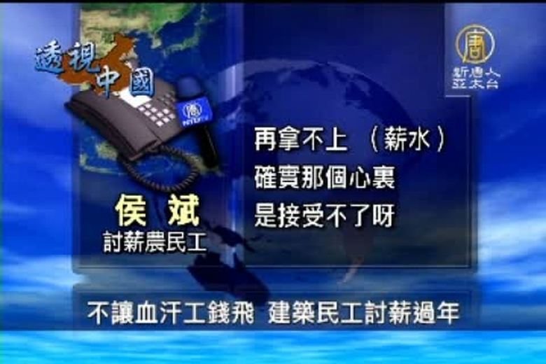 帶您看到中國新聞真相報導。目前在中國票房火爆的電影《讓子彈飛》,片名也成為民工討薪用語。近日,在廣州市街頭有十幾位建築業民工就打出「讓子彈飛、讓物價飛、別讓血汗工錢飛」的討薪標語,要求當地建築商支付拖欠了8年的工資,好回家過年。 //asset2.ntdtv.com.tw/public/uploads/video/2011/01/13/20110113-926244.flv 不讓血汗工錢飛|建築民工討薪過年|中共|討薪|農民工|法院|新唐人|政治|財經|社會|體育|影劇|娛樂|教育|醫藥|消費|新聞|民調|藝文|科技|時事|即時新聞|亞太|節目2011-01-12 21:26:38