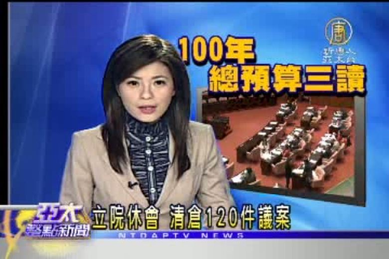 今天是立法院本會期最後一天,一百年度中央政府總預算案是最主要焦點。民進黨團提案導正國民黨「軍公教福利國」的預算分配,要求軍眷補助水電的優惠從兩戶減為一戶,退伍軍人眷屬水電優待則全數刪減。但國民黨團不答應,全數遭到否決。另外,本會期共通過120件議案,包括各項預算案,以及二代健保修法、社會救助法、所得稅法及預算法等重大法案。 //asset3.ntdtv.com.tw/public/uploads/video/2011/01/13/20110113-926230.flv 立院休會|清倉120件議案|新唐人|政治|財經|社會|體育|影劇|娛樂|教育|醫藥|消費|新聞|民調|藝文|科技|時事|即時新聞|亞太|節目2011-01-12 21:11:39