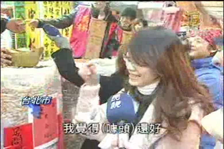 台北年貨大街週日的人氣明顯比第一天多了不少。不少店家為了搶生意,有人打美女牌、還有人掛狗牌,花招盡出。但因為年貨平均價格都比去年上漲二到三成,一眼望去,試吃的民眾變多,買的人卻少了二成。 //asset1.ntdtv.com.tw/public/uploads/video/2011/01/17/20110117-951097.flv 年貨貴2~3成|試吃的多|買的少|新唐人|政治|財經|社會|體育|影劇|娛樂|教育|醫藥|消費|新聞|民調|藝文|科技|時事|即時新聞|亞太|節目2011-01-16 21:44:22