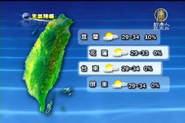 受到太平洋高壓持續增強的影響,全台白天都是晴朗炎熱的天氣,但是各地山區還是有午後雷陣雨發生的機會,氣象局預估,到本週末,都是類似的天氣型態。民眾出門時要記得攜帶雨具,和做好防曬措施,並多補充水分,避免中暑。以下帶您關心8月18號星期四的天氣預報。 //asset3.ntdtv.com.tw/public/uploads/video/2011/08/18/20110818-4024060.flv 2011-08-17 21:57:57