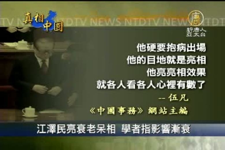 來看到中國新聞真相報導。7月初傳出死訊的前中共總書記江澤民,10月9號高調現身北京「紀念辛亥革命100週年大會」。這是他2009年11月出席錢學森的喪禮後,首次出席官方活動。將近兩年沒有在媒體上公開露過面的江澤民,看起來老朽衰弱。海內外學者指出,江硬撐病體亮相,對十八大實質影響不大。 //asset3.ntdtv.com.tw/public/uploads/video/2011/10/12/20111012-4943090.flv 江澤民|現身|辛亥革命|十八大|中共2011-10-11 21:29:07