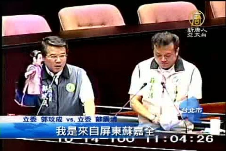隨著選情白熱化,競選花招也變的更多元。民進黨立委郭玟成和蘇震清,兩人今天(14日)在立法院質詢時,拿出布袋戲偶,演出一場政治嘲諷劇,讓吳敦義和台下官員看了,直搖頭。 //asset2.ntdtv.com.tw/public/uploads/video/2011/10/15/20111015-4991704.flv 布袋戲|質詢|吳敦義|立法院|台北2011-10-14 21:25:52