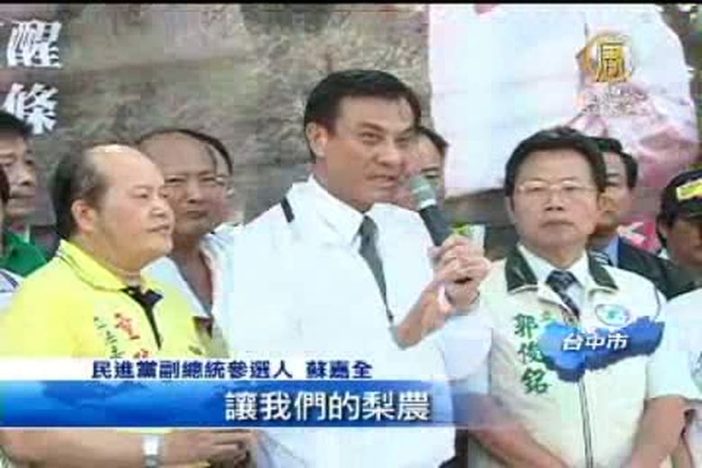 今年高接梨梨子價格慘跌,梨農叫苦連天。民進黨副總統參選人蘇嘉全提出包括啟動九五機制的五項對策,更在豐原火車站幫忙促銷,以實際行動來幫助果農。 //asset1.ntdtv.com.tw/public/uploads/video/2011/10/26/20111026-5166503.flv 蘇嘉全|高接梨|價格|老農津貼|台中2011-10-25 21:48:49
