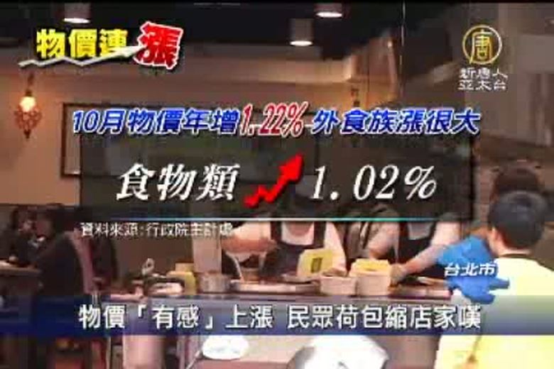 景氣不樂觀,物價也漲的讓民眾受不了。主計處公布今年10月份物價概況,消費者物價指數和去年同期相比,雖然年增率1.22%,比起前兩個月略降,但是隨著最近連鎖商店咖啡漲價,帶動10月份家外食物上漲2%,很多外食族一個月的伙食費就增加了一兩千塊錢,大嘆吃不消。 //asset1.ntdtv.com.tw/public/uploads/video/2011/11/09/20111109-5393427.flv 物價上漲|消費指數|CPI|台北2011-11-08 21:10:31