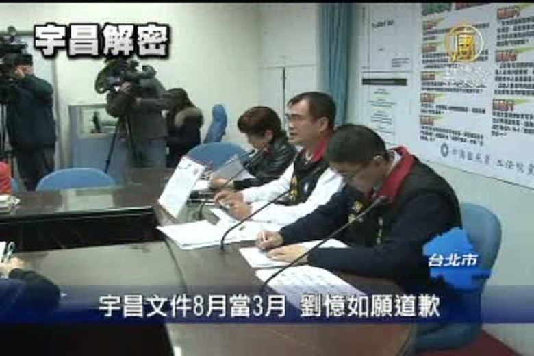 昨天國民黨舉行宇昌案公文揭密記者會,其中立委就經建會的資料,質疑蔡英文批准公文的後九天,就宣告出任生技公司董事長。然而,現在傳出,這份資料的時間點其實應該再晚四個多月,當時的蔡英文已經卸任。對於造成誤會,劉憶如表示,願意道歉。 //asset3.ntdtv.com.tw/public/uploads/video/2011/12/14/20111214-5942426.flv 宇昌|解密2011-12-13 21:06:35