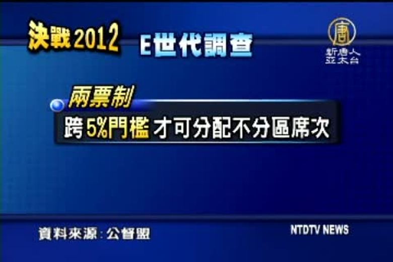 2012,除了總統,還有立委的選舉。那麼針對明年的立委選舉,公督盟等多個團體作調查,發現有四成八E世代的選民,目前還沒有決定政黨票的取向,而有六成的人希望,不分區立委排序由投票決定,學者說,各黨應該在最後一個月趕緊拿出政策牛肉,給民眾交代。 //asset1.ntdtv.com.tw/public/uploads/video/2011/12/15/20111215-5960717.flv 公督盟2011-12-14 21:04:29