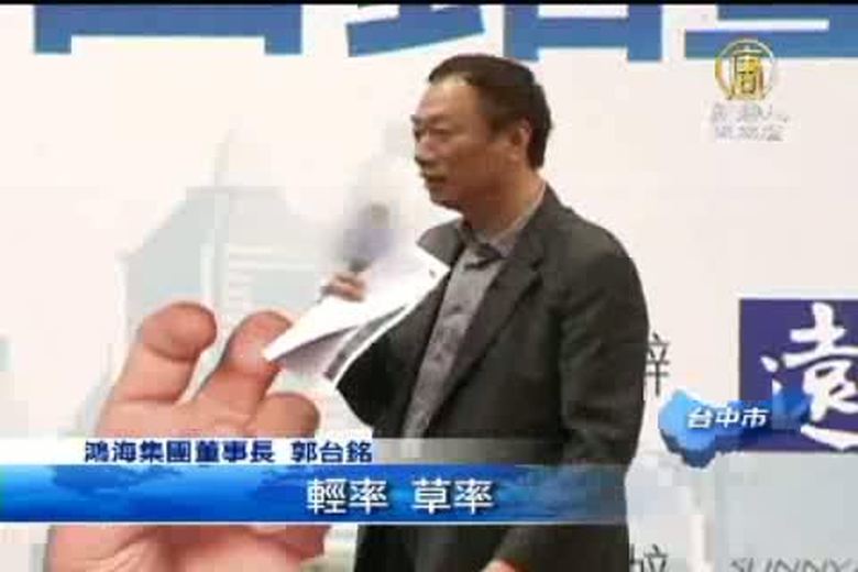 鴻海集團董事長郭台銘昨天(14日)來到台中逢甲大學,和年輕人分享人生經驗,吸引數千名大學生聆聽。他鼓勵年輕人要執著、要有責任感,不怕從小螺絲釘做起,他自己也是從基層開始的。 //asset3.ntdtv.com.tw/public/uploads/video/2011/12/16/20111216-5980651.flv 郭台銘|演講|責任|逢甲大學|台中2011-12-15 21:52:22