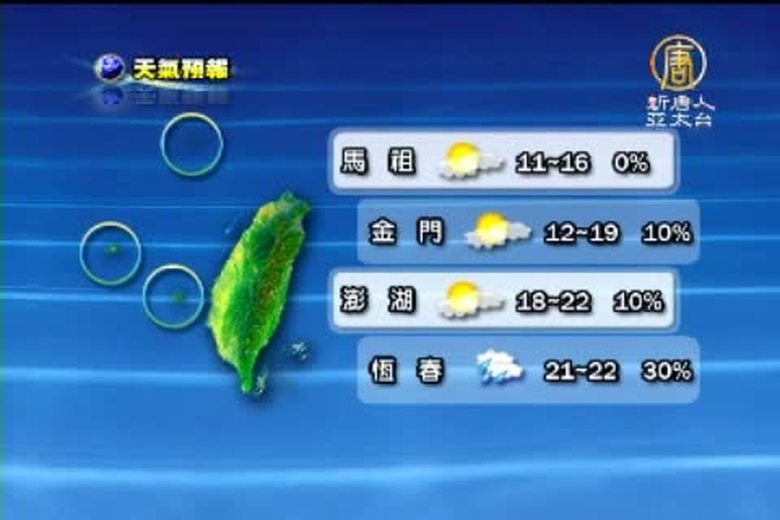 以下帶您關心12月19號星期一,全台各地以及世界各主要城市的天氣預報。 //asset3.ntdtv.com.tw/public/uploads/video/2011/12/19/20111219-6028018.flv 2011-12-18 21:30:06