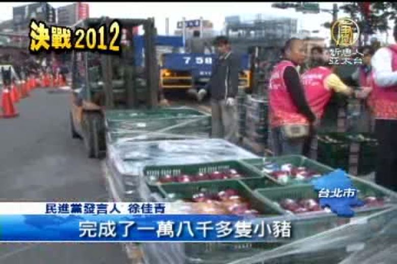 接著來看到今天的選戰新聞。民進黨的小豬回娘家活動,在全台灣募集了超過十萬隻小豬。今天(18號),在蔡英文競選總部外,舉辦了大型活動,還用上萬隻小豬在地上排成了台灣的圖案。 //asset1.ntdtv.com.tw/public/uploads/video/2011/12/19/20111219-6028013.flv 決戰2012|總統大選|民進黨|小豬2011-12-18 21:19:53