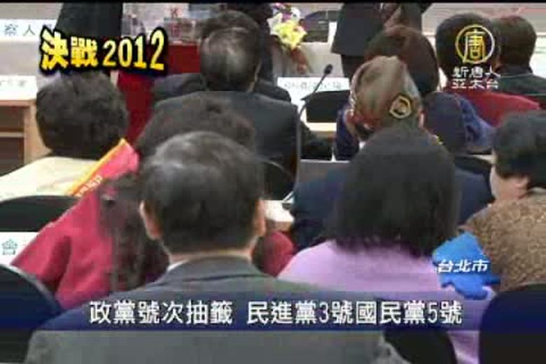 新聞一開始,帶您關心,選戰進入倒數24天,中選會今天(21日)早上進行政黨號次抽籤,國民黨由立法院長王金平代表抽籤,結果抽中5號,民進黨則是由陳節如委員抽中3號。這次選舉,總共有11個政黨,要爭取立法院34席的不分區立委席次。 //asset2.ntdtv.com.tw/public/uploads/video/2011/12/22/20111222-6075786.flv 決戰2012|總統大選|選舉|政黨|立委選舉|中選會2011-12-21 21:02:47