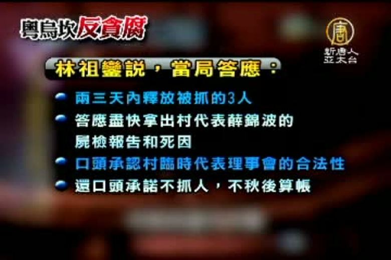 廣東烏坎抗暴事件,在這個禮拜出現戲劇性的發展,星期二,中共當局對連日抗暴的廣東烏坎村民,採取了和解的姿態,村民也因此取消了在星期三的示威遊行。那麼面對中共當局口頭上答應村民的訴求,專家認為,這只不過是中共的心理戰術,預估烏坎事件,不會很快的得到解決。 //asset2.ntdtv.com.tw/public/uploads/video/2011/12/23/20111223-6095099.flv 薛錦波|烏坎村|廣東|陸豐|文昭2011-12-22 21:06:48