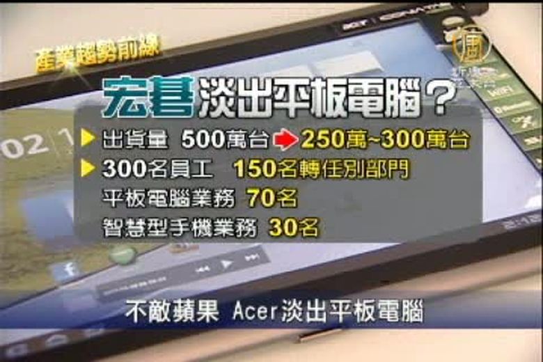 蘋果平板電腦ipad2市佔率高,繼惠普平板電腦代工廠是廣達,和RIM代工廠英業達大裁員後,現在Acer也要淡出平板電腦市場,而且300名人力縮減到70人,不過Acer也澄清,是要走精兵政策,不會有裁員和放無薪假的狀況發生。 //asset3.ntdtv.com.tw/public/uploads/video/2011/12/24/20111224-6118481.flv 宏碁|平板電腦ipad22011-12-23 21:16:22