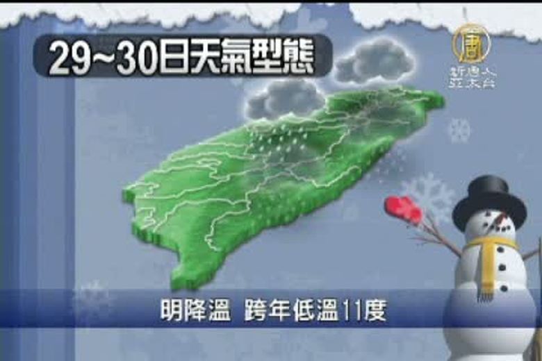 好的,謝謝吳教授的分析。來關心天氣,天氣好不容易放晴回暖,不過從明天(29日)起又會受到東北季風影響,不但各地都會有短暫雨,氣溫也會開始下降,到了週六(31日)跨年,還有冷氣團會報到,夜間低溫下探11度,民眾可能要在低溫下雨中倒數跨年。 //asset1.ntdtv.com.tw/public/uploads/video/2011/12/29/20111229-6187412.flv 氣溫|低溫|冷氣團|氣象|跨年|台北2011-12-28 21:12:07