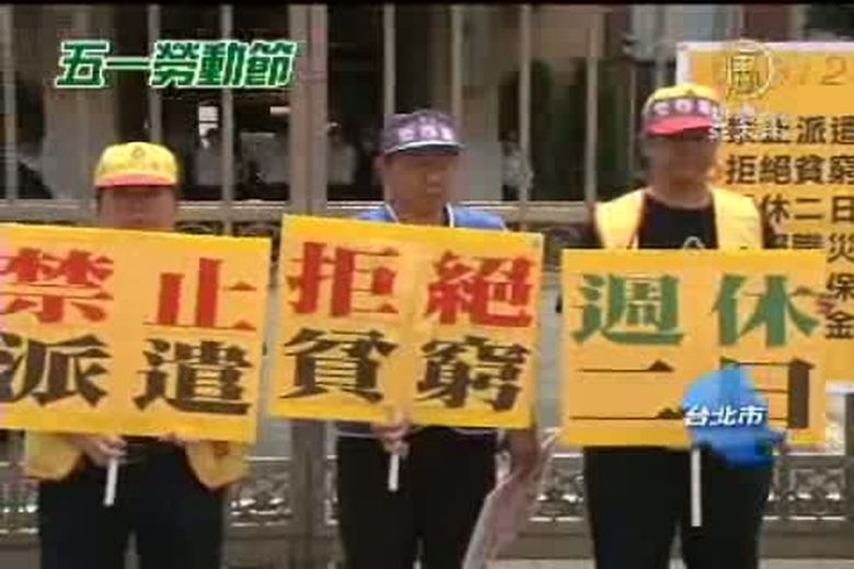 來看另一個新聞焦點。今天是勞動節,全國各勞工團體分進合擊,走上街頭表達訴求。上午在總統府前舉辦了一場勞工運動會,諷刺政府重財團、漠視勞動人權;全國產業總工會也到立法院陳情,提出尊嚴勞動6大訴求。到了中午,由團結工聯發起的「勞工反剝削大遊行」接力進行。面臨油電雙漲、物價攀升,勞動條件不見改善,全國勞團總動員,表達不滿的心聲。 //asset3.ntdtv.com.tw/public/uploads/video/2012/05/02/20120502-8173672.flv 五一|勞動節|勞團|油電雙漲2012-05-01 21:21:18