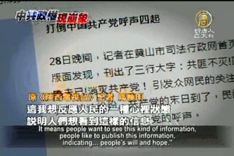 繼續來關心,就在「黃山市司法局」和「大連市甘井子區政法委員會」的網站上,出現「消滅共產黨」、「打倒中國共產黨」的字樣後,4月29號,吉林省「臨江市環保局」的官網,也出現倒共標題和口號;另外,《百度》搜索引擎,則是驚現大量「陳光誠出逃」等相關新聞。怎麼看待中國網站不斷有敏感關鍵字解禁?我們的分析報導。 //asset1.ntdtv.com.tw/public/uploads/video/2012/05/02/20120502-8173667.flv 中共崩解|百度|周永康2012-05-01 21:13:54