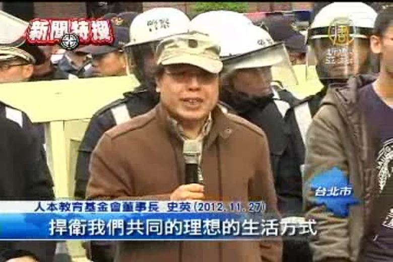 一個月前,11月27日,人本教育基金會董事長史英,到反媒體壟斷學生們夜宿行政院的現場,為下一代能勇敢站出來,跟他們加油打氣。20多年來,史英一本 初衷,總是站在社會改革的前線,面對現今紅色政權對台灣民主的威脅,史英也希望能有更多人,一起站出來與學生們並肩作戰。 //asset3.ntdtv.com.tw/public/uploads/video/2012/12/29/20121229-12258161.mp4 台灣要聞|反媒體壟斷|史英|學生2012-12-28 21:16:41