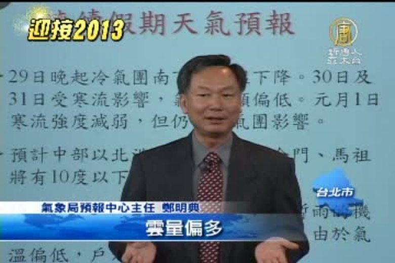 元旦四天的假期,現在已經開始,大家都關心元旦4天連假的天氣,到底如何?來告訴您,週六晚上,會有一波強烈大陸冷氣團報到,氣象局說超過一半機率會形成,入冬以來首波寒流,溼溼冷冷的天氣,要陪伴民眾到 2013年,提醒民眾別忘了注意保暖,而今年想看到元旦的第一道曙光,機率很低,只能在雲縫中碰運氣。 //asset1.ntdtv.com.tw/public/uploads/video/2012/12/29/20121229-12258140.mp4 天氣預報|鄭明典|寒流|曙光2012-12-28 21:13:07