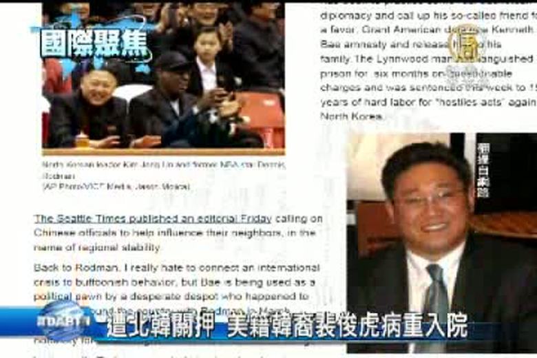 被北韓判處15年勞教的韓裔美籍基督教傳教士裴俊虎飽受折磨,近日傳出因心臟肥大、慢性糖尿病、背部和腿部等病痛,被迫接受北韓國營醫院治療。7月初,北韓刻意讓裴俊虎接受媒體專訪,裴俊虎在專訪中就曾經發出求救訊號。 //asset2.ntdtv.com.tw/public/uploads/video/2013/08/13/20130813-16283658.mp4 國際聚焦|裴俊虎|勞教|傳教士|北韓2013-08-12 22:14:30