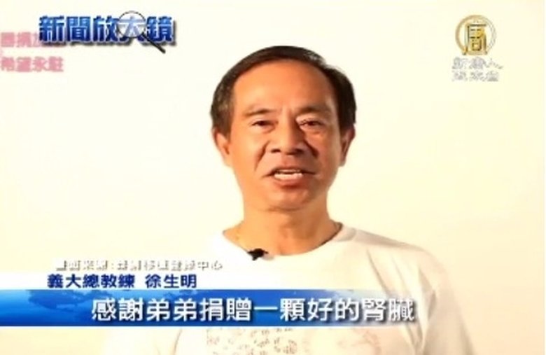 義大總教練徐生明因為心肌梗塞往生。九年前,他因為罹患腎衰竭,接受了弟弟腎臟活體移植,手術成功後,重回球場,還為台灣的器官捐贈中心拍宣傳短片,鼓勵更多人加入無償器捐行列。 //asset3.ntdtv.com.tw/public/uploads/video/2013/08/27/20130827-16602968.mp4 台灣要聞|器捐|徐生明|馬英九|移植2013-08-26 22:12:39