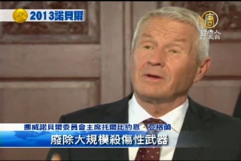 備受矚目的諾貝爾和平獎揭曉。諾貝爾委員會11日宣佈,今年的和平獎,頒發給禁止化學武器組織(OPCW),表彰其為銷毀全世界化學武器的努力。 //asset3.ntdtv.com.tw/public/uploads/video/2013/10/13/20131013-17723544.mp4 國際聚焦|諾貝爾和平獎|化學武器|禁止化學武器組織|敘利亞2013-10-12 21:36:46