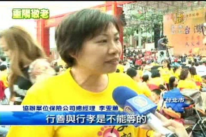 今天是重陽節,是弘揚孝道、敬老尊賢的日子。昨天(12日)在凱達格蘭大道,就有一場萬人為父母洗腳盡孝道的活動。這是雲林同鄉總會與南部一家保險公司與台北市政府合作,號召6699對親子參與,最後是4363對來參加,還是打破了先前在屏東縣舉辦的母親節洗腳活動,創金氏世界紀錄。 //asset2.ntdtv.com.tw/public/uploads/video/2013/10/14/20131014-17738351.mp4 台灣要聞|萬人洗腳表孝心|許淑淨|李雯蕙|台北2013-10-13 21:08:44