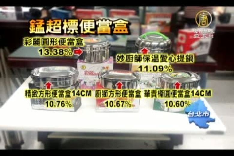 坊間不銹鋼便當盒屢傳錳超標,台北市衛生局9月抽檢市面上20件不銹鋼食品容器,其中12件沒有標示不銹鋼種類符號,這12件中有5件錳含量超出不銹鋼錳 含量的最高規範10%,錳攝取過量對人體會有危害,雖然目前國內並無罰則,但衛生局要求業者將不鏽鋼種類標示清楚,讓消費者有判斷的依據 。 //asset2.ntdtv.com.tw/public/uploads/video/2013/10/15/20131015-17744560.mp4 台灣要聞|不銹鋼便當盒|衛生局|台北2013-10-14 21:46:10