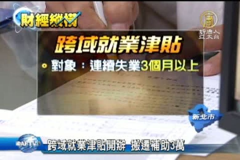為了解決失業跟區域性缺工的問題,勞委會今天開始,推出「跨域就業津貼」,只要失業勞工願意離家30公里到外縣市工作,無論是搬遷、租屋或是通勤都有津貼補助。 //asset1.ntdtv.com.tw/public/uploads/video/2013/10/19/20131019-17815027.mp4 台灣要聞|薪資|失業|區域性缺工|勞委會|跨域就業津貼2013-10-18 22:11:40