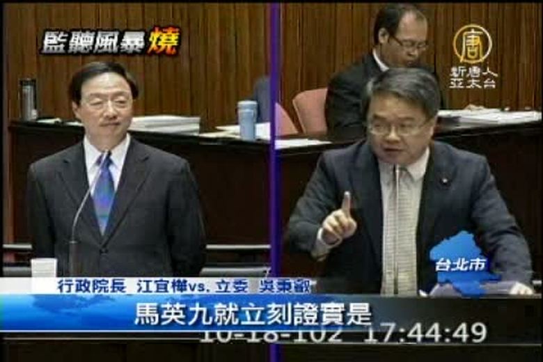 檢察總長洩密案,北檢10月3日傳喚馬江羅黃四巨頭,之後過了半個月,都還沒結案,有立委質疑檢察官,要看社會風向球,才決定是否起訴;現在不分藍綠,都有要求黃世銘停職接受調查的聲音,但昨天江宜樺接受質詢時卻說,他不便介入。 //asset3.ntdtv.com.tw/public/uploads/video/2013/10/20/20131020-17833405.mp4 台灣要聞|黃世銘|監聽|特偵組|洩密案2013-10-19 21:42:06