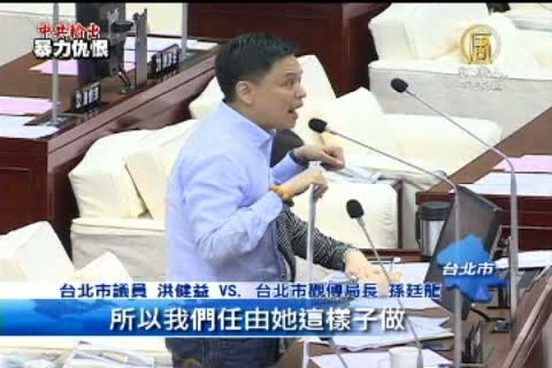 愛國同心會持續在台北101大樓煽動仇恨法輪功,擴大騷擾行徑。台北市議員洪健益今天拿出騷擾影片質詢,要求台北市觀傳局正視,對此,觀傳局長孫廷龍回應,同心會行為不適當,也確實會影響觀光品質。 //asset3.ntdtv.com.tw/public/uploads/video/2013/10/25/20131025-17914023.mp4 台灣要聞|同心會|洪健益|觀傳局|孫廷龍2013-10-24 21:50:46